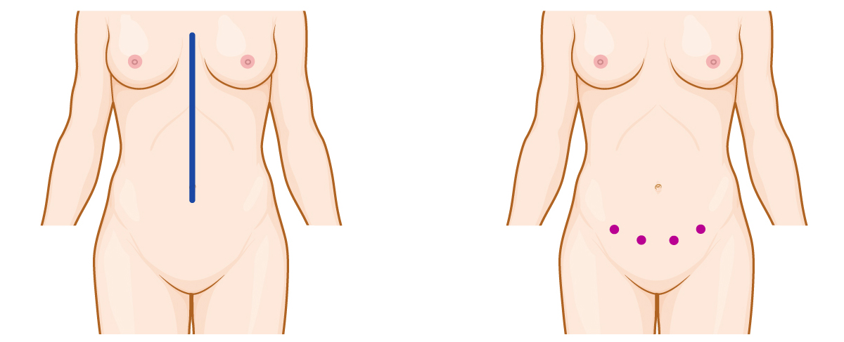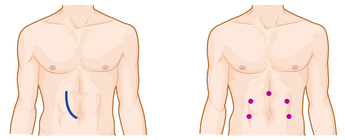 | Long incision on abdomen | Surgery via 4 to 5 holes |