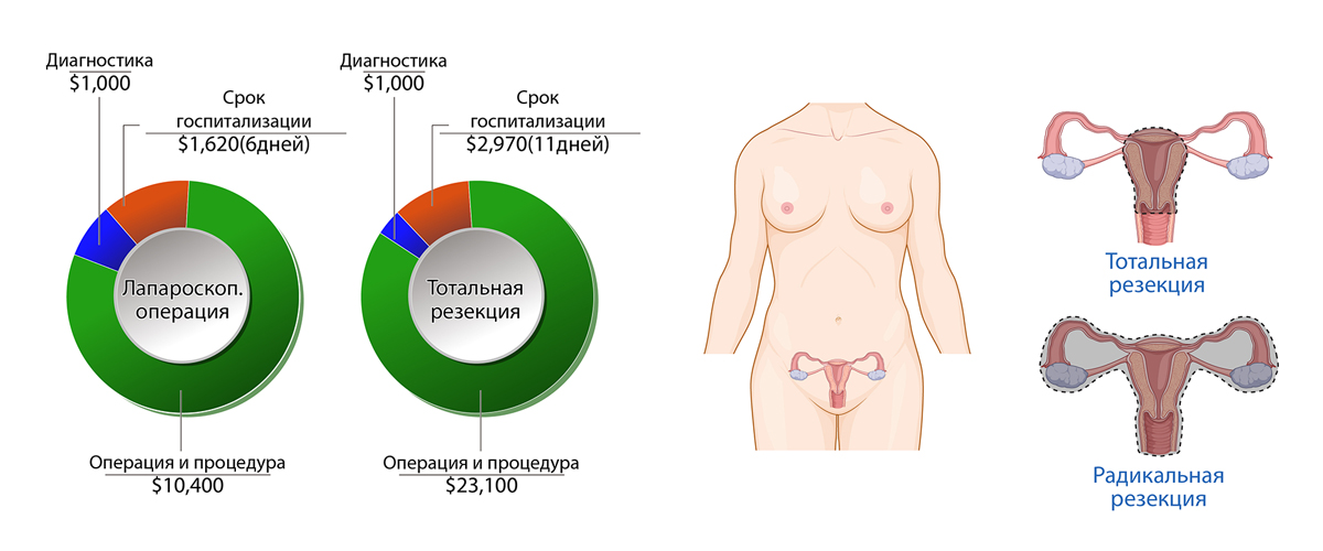 При раке матки, шейки матки, эндометрия, операция проводится лапароскопическим, лапаротомическим способом. При необходимости операция проводится совместно со специалистами общей хирургии и урологии