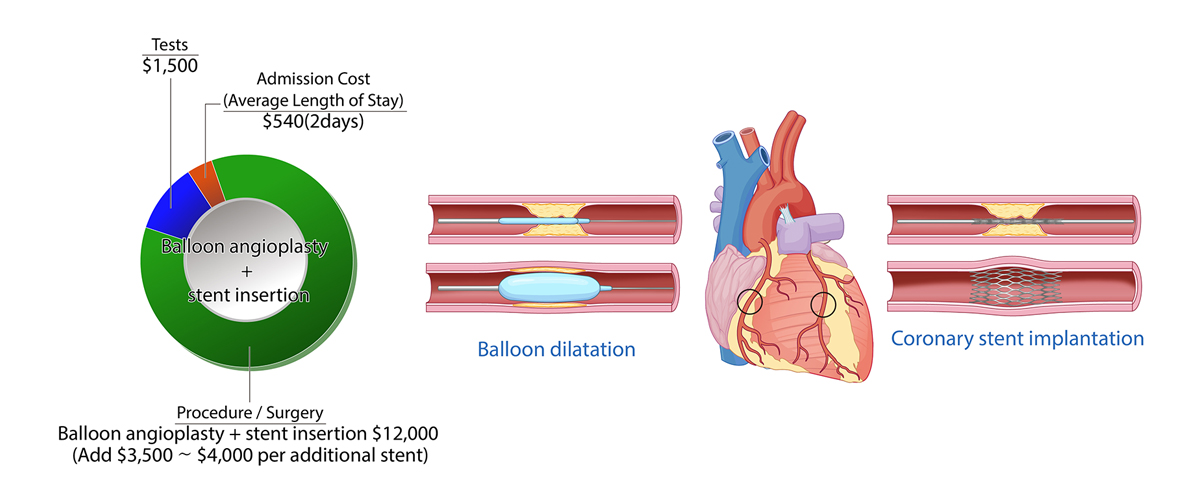 Coronary angioplasty, also called percutaneous coronary intervention, is a non-surgical procedure to open narrowed coronary arteries to restore blood flow. It uses a balloon catheter that widens up the coronary artery, and a stent (a small mesh) can be also implanted in the artery to decrease the chance of re-narrowing.