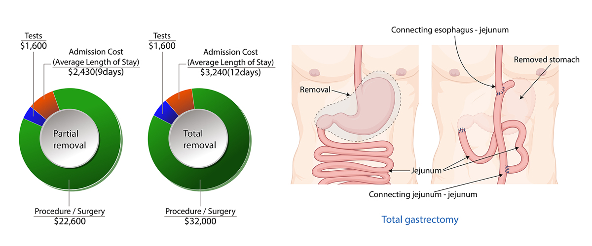 进行性胃癌,通过腹腔镜或开腹,进行部分切除术,全切除,近端部分切除术,联合切除和幽门保存手术